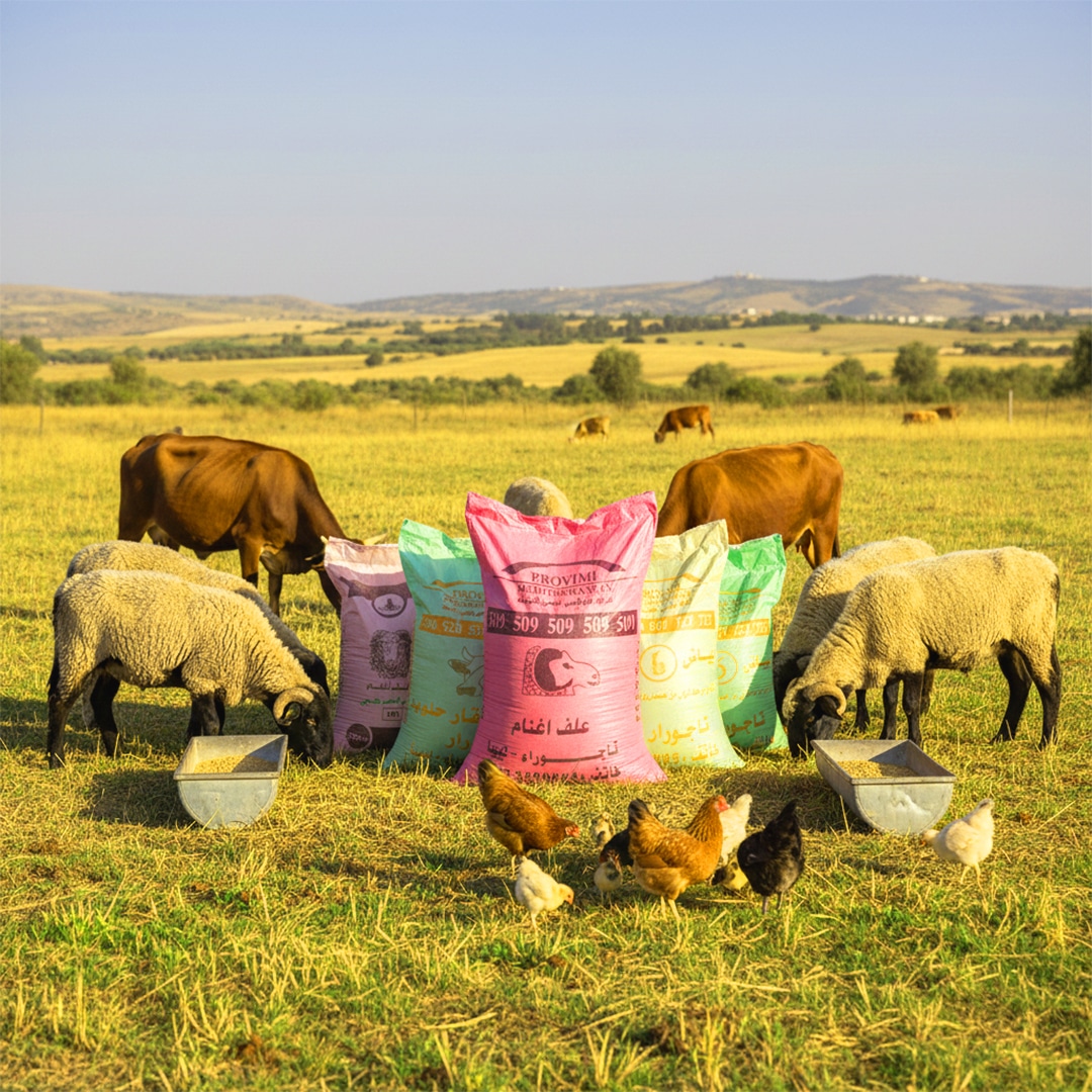 إنتاج الأعلاف: أعلاف متكاملة للدواجن، الأغنام، الأبقار، والإبل.